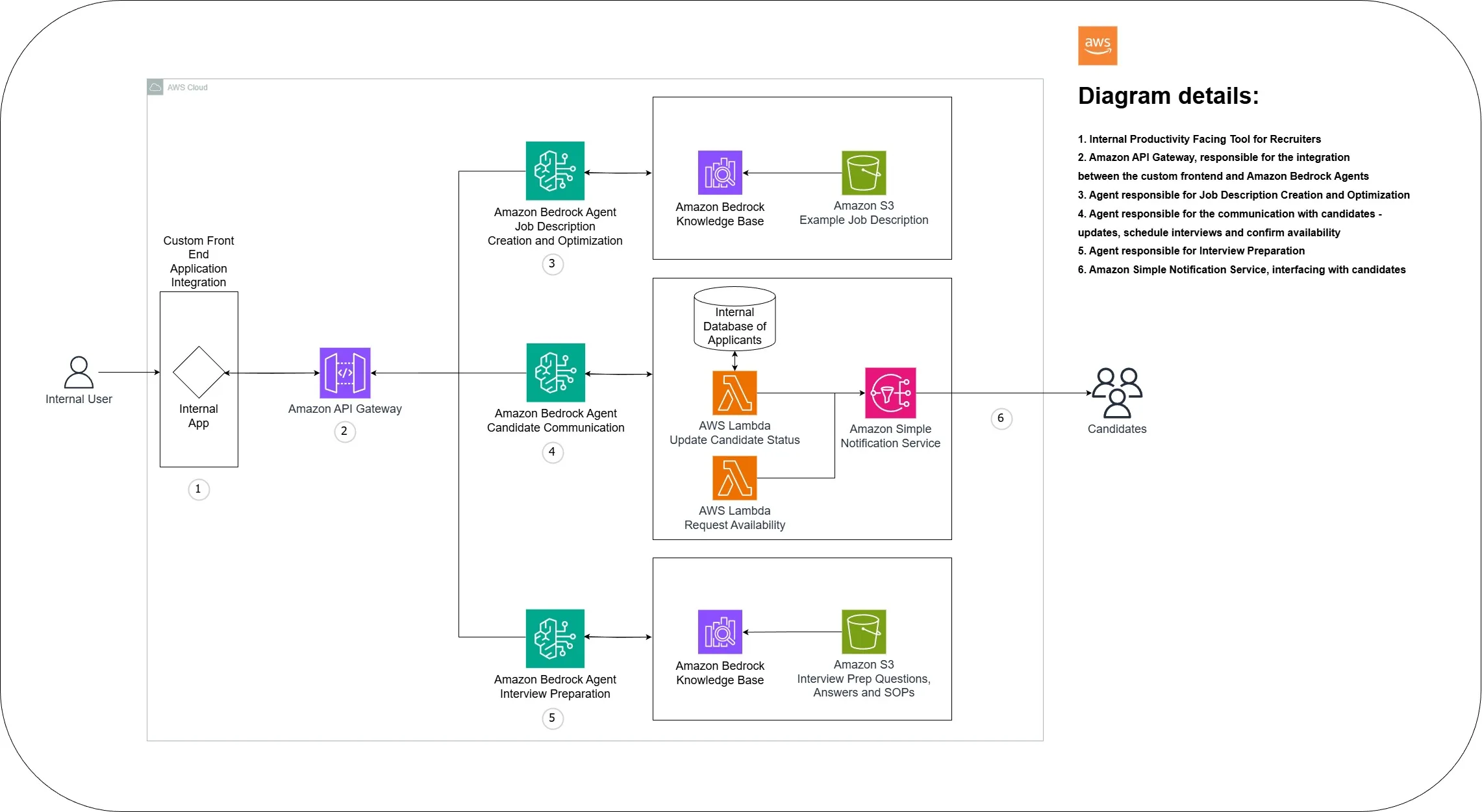 In this post, we show how to create an AI-powered recruitment system using Amazon Bedrock, Amazon Bedrock Knowledge Bases, AWS Lambda, and other AWS services to enhance job description creation, candidate communication, and interview preparation while maintaining human oversight.