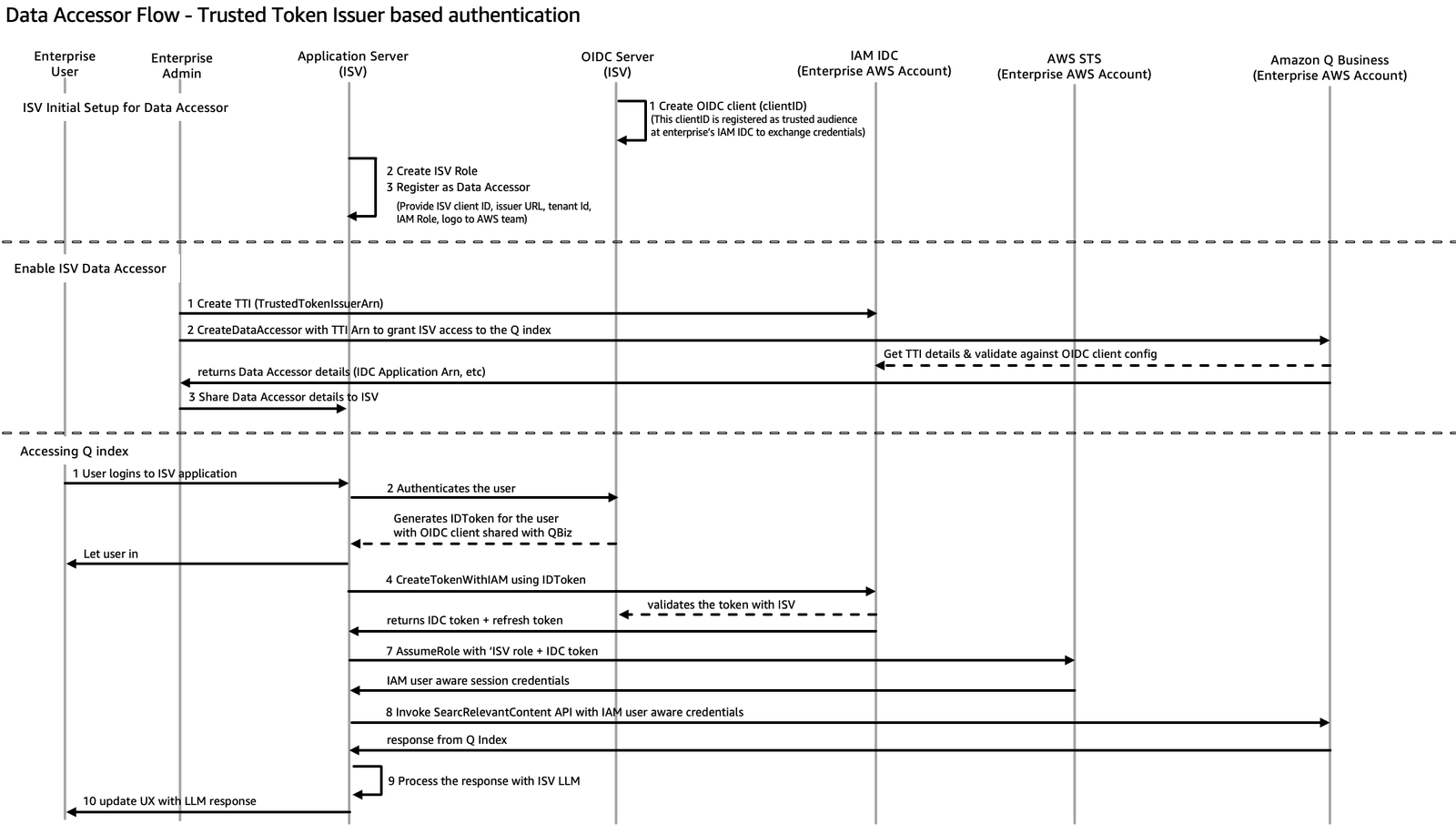 Prior to TTI support, data accessors needed to implement authorization code flow with AWS IAM Identity Center integration when accessing the Amazon Q index. With TTI support for data accessors, ISVs can now use their own OpenID Provider to authenticate enterprise users, alleviating the need for double authentication while maintaining security standards.