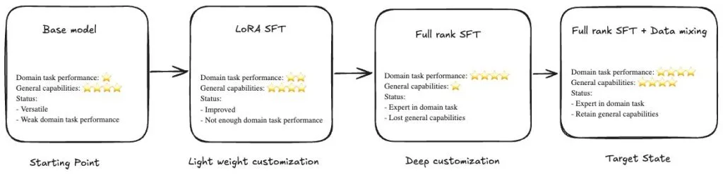 Full-rank SFT often faces a challenge: catastrophic forgetting. As models learn domain-specific patterns, they lose general capabilities including instruction-following, reasoning, and broad knowledge. Organizations must choose between domain expertise and general intelligence, which limits model utility across enterprise use cases.