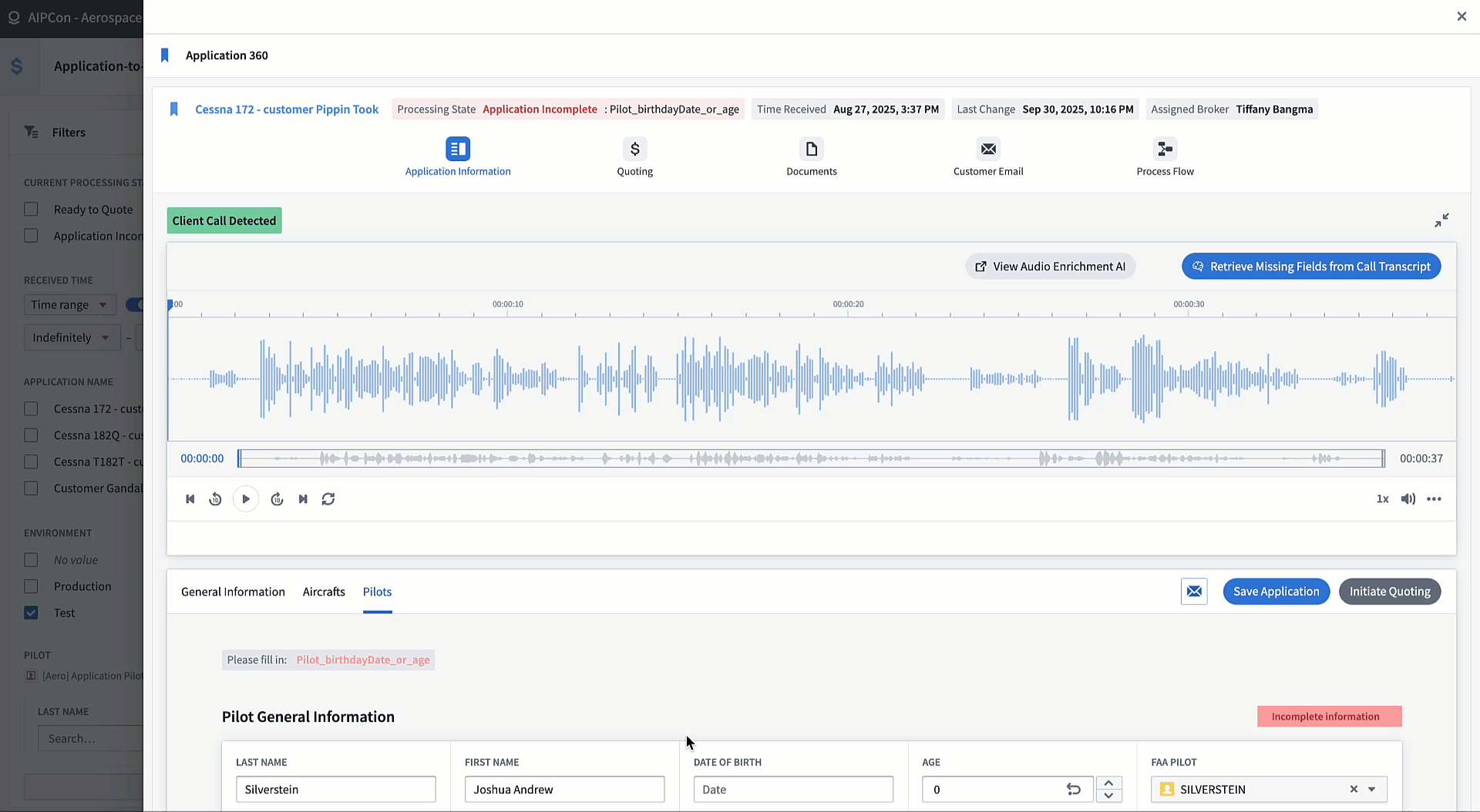 The system then verifies application completeness, continuously monitoring submissions to identify missing required information through real-time data validation. When incomplete applications are detected, the platform flags specific data gaps and provides automated remediation pathways. Brokers can address the missing information manually through Foundry’s intuitive interfaces or leverage AIP’s audio transcription capabilities that automatically extract missing details from recorded phone conversations, facilitating seamless data capture.