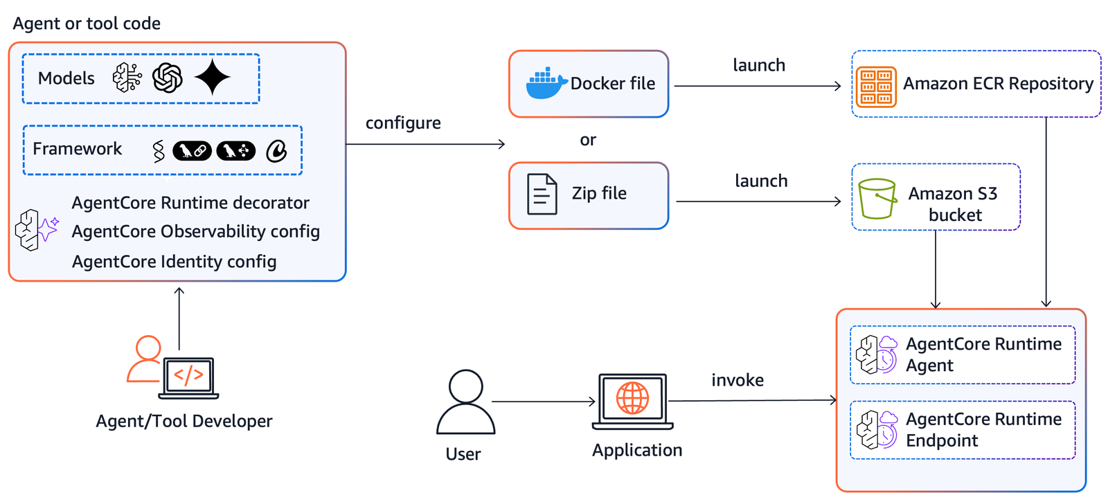 With direct code deployment, developers create a zip archive of code and dependencies, upload to Amazon S3, and configure the bucket in the agent configuration. When using the AgentCore starter toolkit, the toolkit handles dependency detection, packaging, and upload which provides a much-simplified developer experience. Direct code deployment is also supported using the API.