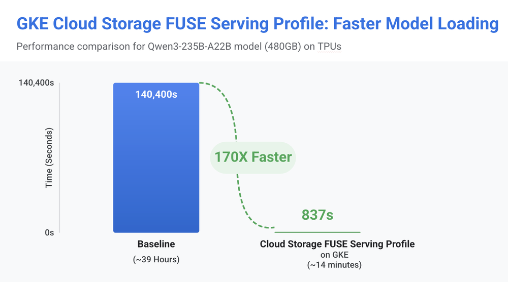 Using GKE Cloud Storage FUSE Profiles inference profile, we were able to reduce model loading time for a Qwen3-235B-A22B workload on TPUs (480GB) from 39 hours to just 14 minutes, helping customers achieve the maximum benefit of Cloud Storage FUSE GCSFuse out-of-the-box.