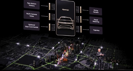 “Not only does it take sensor input and activates steering wheel, brakes and acceleration, it also reasons about what action it is about to take,” Huang said, teeing up a video showing a vehicle smoothly navigating busy San Francisco traffic.