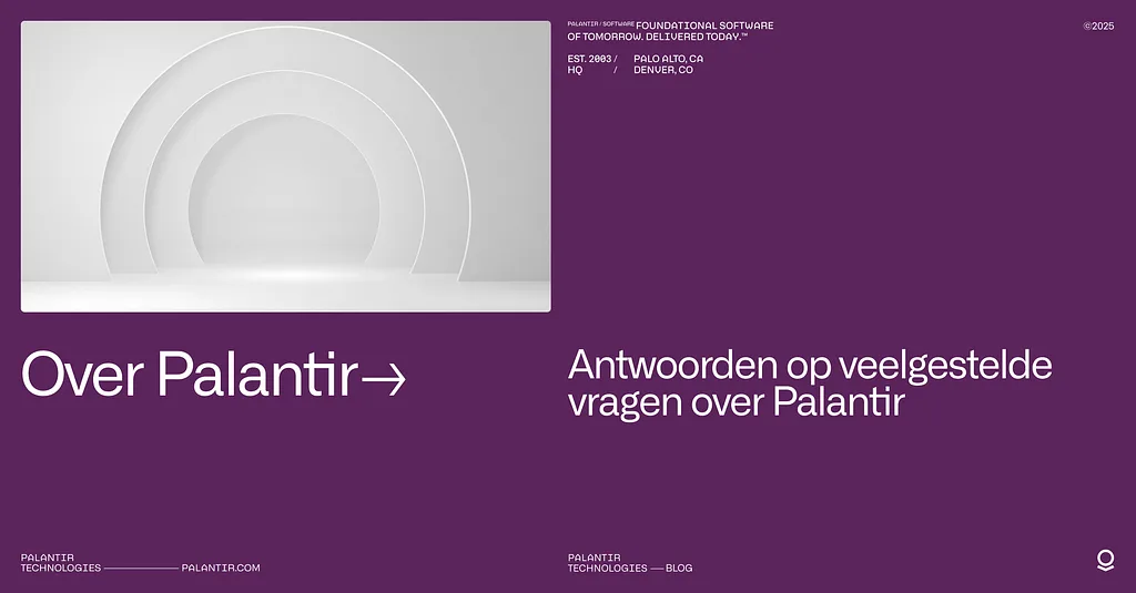 Palantir Technologies is een softwarebedrijf. Wij maken software platforms voor data en kunstmatige intelligentie (KI, ook bekend als AI) en ondersteunen organisaties in de publieke, private en non-profit sector. Met onze software helpen wij klanten om hun belangrijkste missies te realiseren en werken wij samen met organisaties die complexe en gevoelige data beheren. Palantir is opgericht in 2003 en heeft het hoofdkantoor in Denver, Colorado.