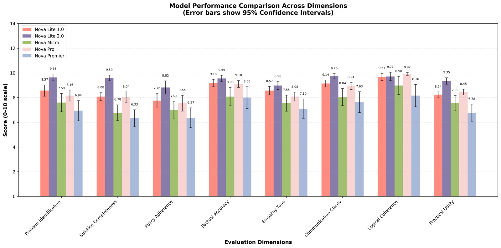 We evaluate five Amazon Nova models across five customer support scenarios, measuring performance on eight dimensions: