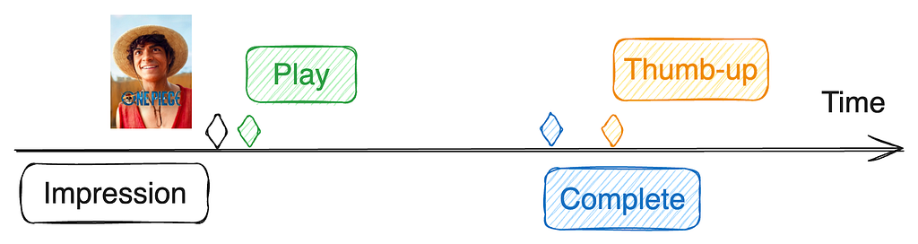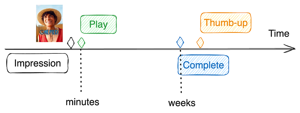User feedback used in the proxy reward function is often delayed or missing. For example, a member may decide to play a recommended show for just a few minutes on the first day and take several weeks to fully complete the show. This completion feedback is therefore delayed. Additionally, some user feedback may never occur; while we may wish otherwise, not all members provide a thumbs-up or thumbs-down after completing a show, leaving us uncertain about their level of enjoyment.