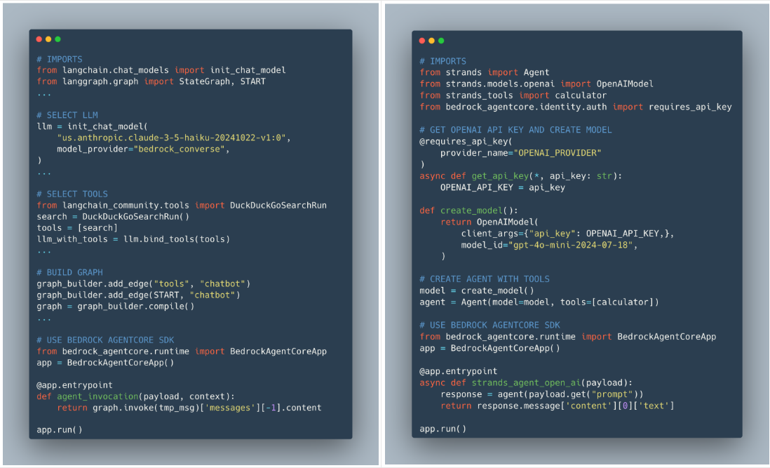 Let’s examine how AgentCore Runtime supports two different frameworks and model providers: