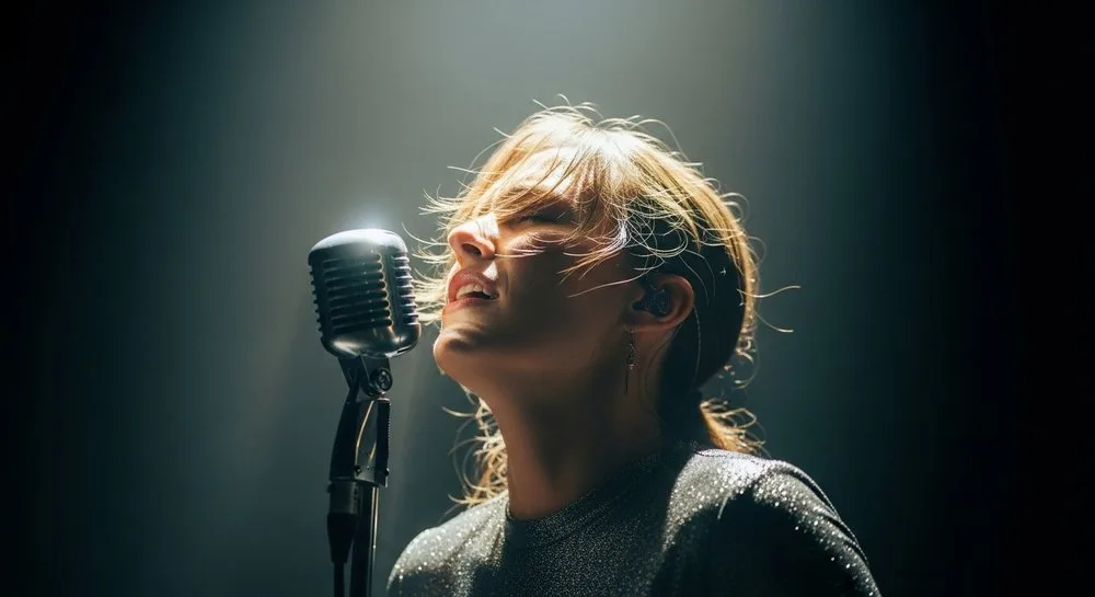 “Medium shot of a female pop star singing passionately into a vintage microphone. She is on a dark stage, lit by a single, dramatic spotlight from the front. She has her eyes closed, capturing an emotional moment. Photorealistic, cinematic.”